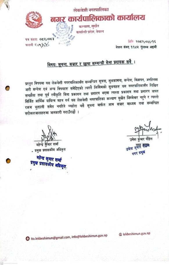 नेपाल सरकारको वि.सं.२०७३ फागुन २७ गतेको निर्णयानुसार साविकका ५ वटा गाविसहरु लेखफर्सा, दशरथपुर, नेटा, कल्याण र साटाखानी लाई एक आपसमा गाभेर मिलाइ १० वटा वडामा विभाजन गरी यो लेकवेशी नगरपालिकाको संरचना तयार पारिएको हो । कुल १८०.९२ बर्ग कि.मी. क्षेत्रफमा फैलिएको यो नगरपालीका सुर्खेतका ९ वटा स्थानीय तहहरु मध्य क्षेत्रफलका हिसाबले दोस्रो सानो नगरपालीका एंवम तेस्रो सानो स्थानिय तह मा पर्दछ ।