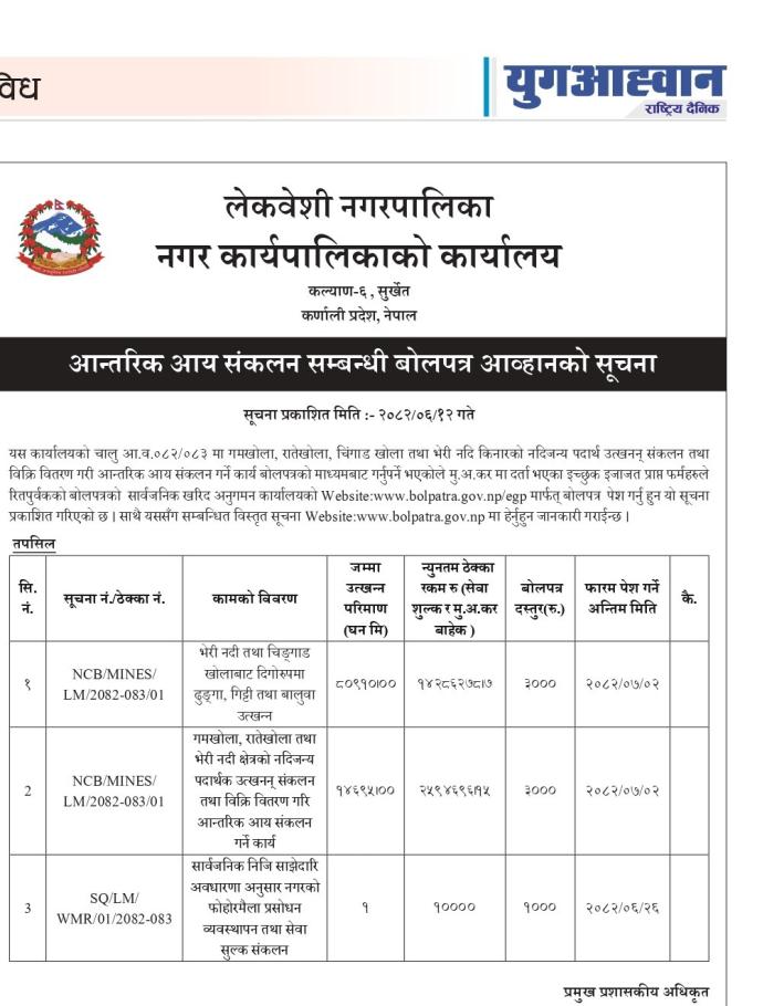 आन्तरिक आय संकलन सम्बन्धि बोलपत्र आह्वानको सूचना