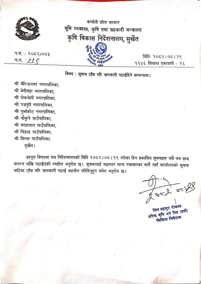 » कृषि विकास निर्देशनालय सुर्खेतको आ.व.२०८२/०८३ को वार्षिक स्वीकृत कार्यक्रममा प्रस्ताव पेश गर्ने सम्बन्धी सूचना