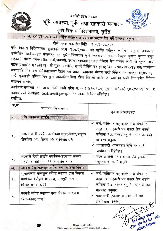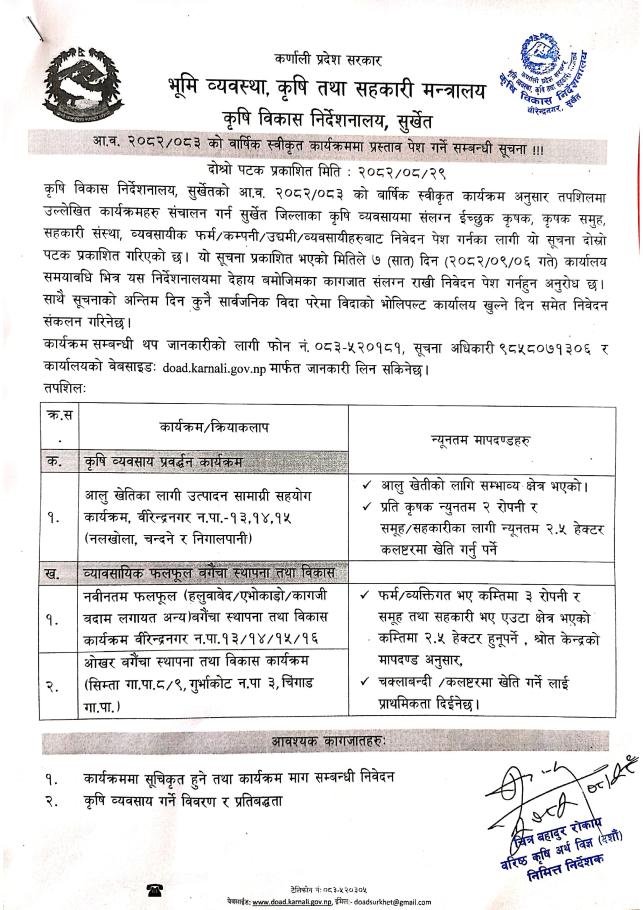 कृषि विकास निर्देशनालय सुर्खेतको आ.व.२०८२/०८३ को वार्षिक स्वीकृत कार्यक्रममा प्रस्ताव पेश गर्ने सम्बन्धी सूचना
