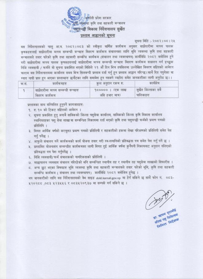 पशुपन्छी विकास निर्देशनालय सुर्खेतको प्रस्ताव आह्वानको सूचना