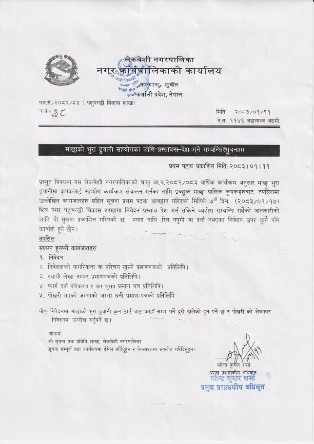 » माछाको भुरा ढुवानी सहयोगका लागि प्रस्तावना पेश गर्ने सम्बन्धमा सूचना |