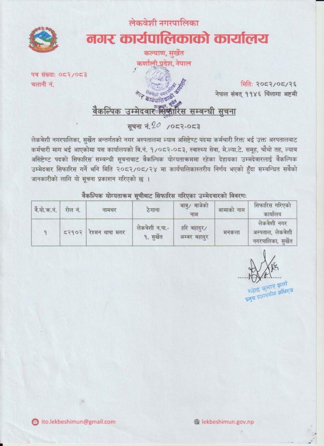 वि.नं. ०३/०८२-८३, स्वास्थ्य सेवा, हे.ई. समूह, सातौ तह, जनस्वास्थ्य अधिकृत पदको सेवा करारमा वैकल्पिक उम्मेदवार सिफारिस सम्बन्धि सूचना