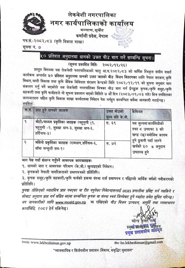 » ५० प्रतिशत अनुदानमा धानको बीउ माग गर्ने सम्बन्धि सूचना।