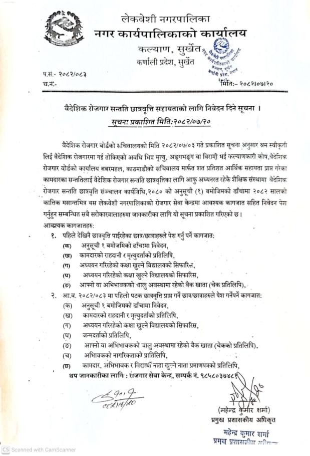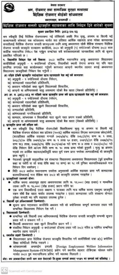 वैदेशिक रोजगार सन्तति छात्रवृत्ति सहायताको लागि निवेदन दिने सूचना