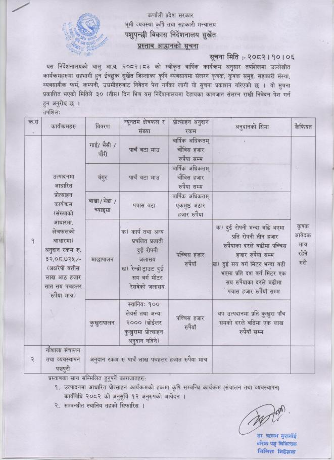 पशुपन्छी विकास सम्बन्धी प्रोत्साहन अनुदानका लागि प्रस्ताव आह्वान सूचना