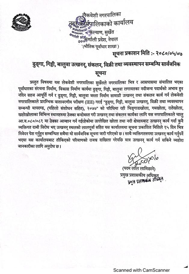 ढुङ्गा,गिट्टी,बालुवा उत्खनन्,संकलन ,बिक्री तथा व्यवसथापन सम्बन्धी सार्वजनिक सूचना।