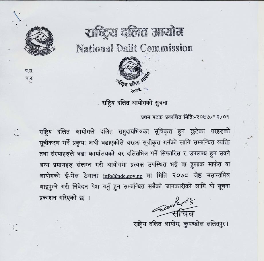 दलित समुदाय भित्र सूचिकृत हुन छुटेका थरहरुको सूचिकरण सम्बन्धमा