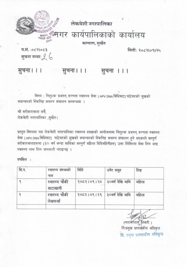 निःशुल्क प्रजनन रूग्णता स्वास्थ्य सेवा (HPV DNA) विधिबाट पाठेघरको मुखको क्यान्सरको स्क्रिनिङ्ग क्याम्प सञ्चालन सम्बन्धी सूचना