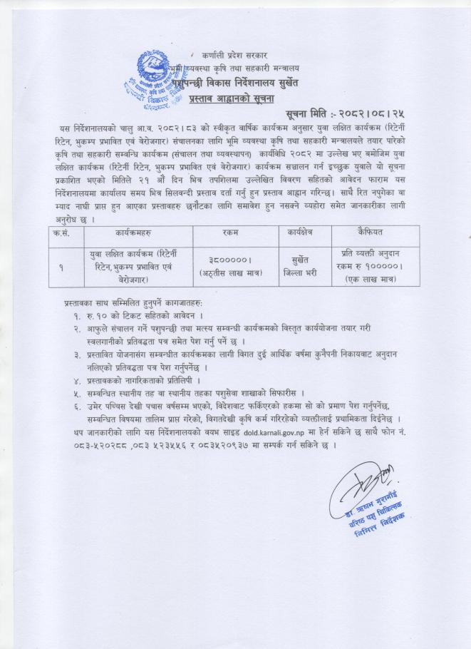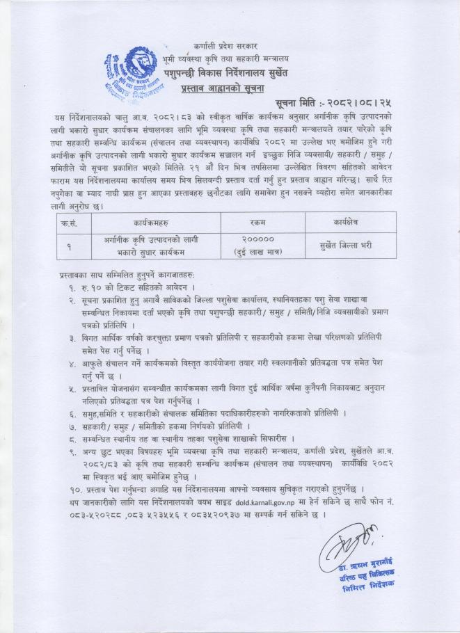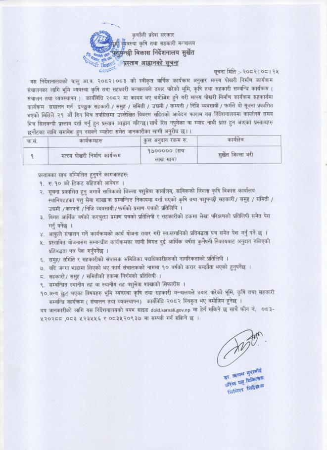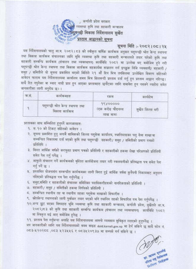 पशुपन्छी विकास निर्देशनालय सुर्खेतको प्रस्ताव आह्वानको सूचना