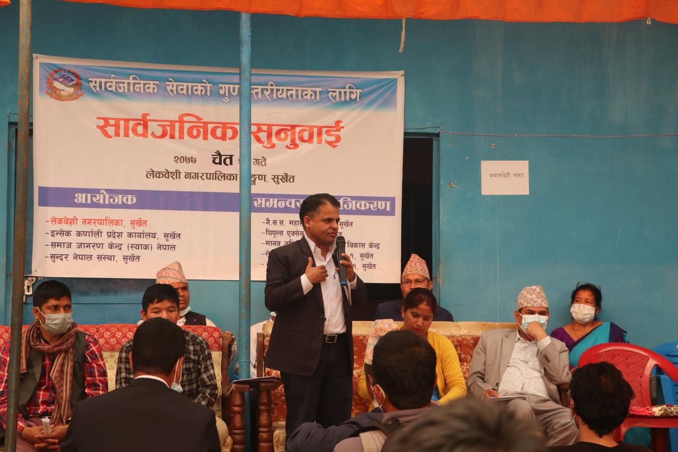 मिति २०७७ चैत्र २३ गते लेकवेशी नगरपालिकामा सार्वजनिक सेवाको गुणस्तरियताका लागी सार्वजनिक सुनुवाई सम्पन्न भएको छ । लेकवेशी नगरपालिका, इन्सेक नेपाल, स्याक नेपाल, सुन्दर नेपाल सुर्खेत को आयोजना र गै स स महासंघ, लेकवेशी सुर्खेत , पिपुल्स एक्सेस नेपाल , सुर्खेत, मानव अधिकार तथा ग्रामिण विकास केन्द्र र स्थानिय क्लबहरुको सहजिकरणमा सम्पन्न भएको कार्यक्रममा नगरपालिकाका सर्वसाधारण, शिक्षक तथा विभिन्न संघ संस्थाका प्रतिनिधिहरुको उपस्थिति रहेको थियो ।कार्यक्रममा सेवा प्रवाह, योजना तर्जुमा तथा कार्यान्वयनका बारेमा प्रश्न राखिएकोमा सम्बन्धित शाखा प्रमुखहरुले ,प्रमुख प्रशासकीय अधिकृत र प्रमुख बक्ता नगर प्रमुख गगन सिं सुनारले जिज्ञासा समाधान गर्ने प्रयास गर्नु भएको थियो ।
