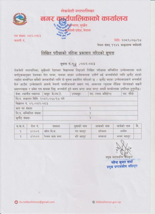 वि.नं. ०२/०८२-०८३, तह तहविहिन, कार्यालय सहयोगी पदको सिफारिस सम्बन्धि सूचना