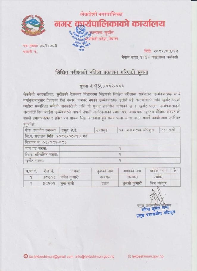 » वि.नं. ३/०८२-०८३, स्वास्थ्य सेवा, हे.ई. समूह, सातौ तह, जनस्वास्थ्य अधिकृत पदको लिखित परीक्षाको नतिजा प्रकाशन गरिएको सूचना