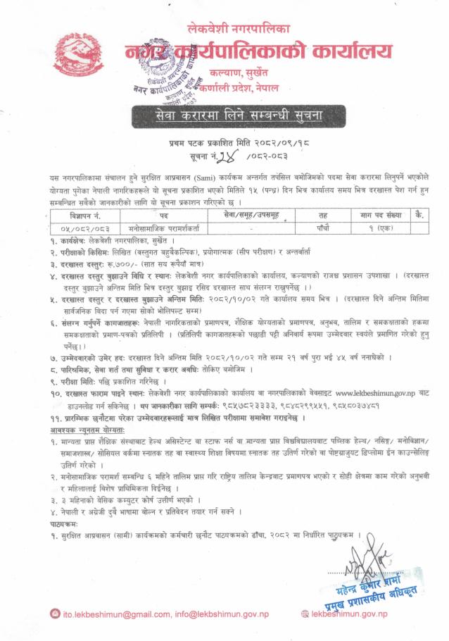 » वि.नं. ५/०८२/-०८३, पाँचौ तह, मनोसामाजिक परामर्शकर्ता सेवा करारमा लिने सम्बन्धी सूचना