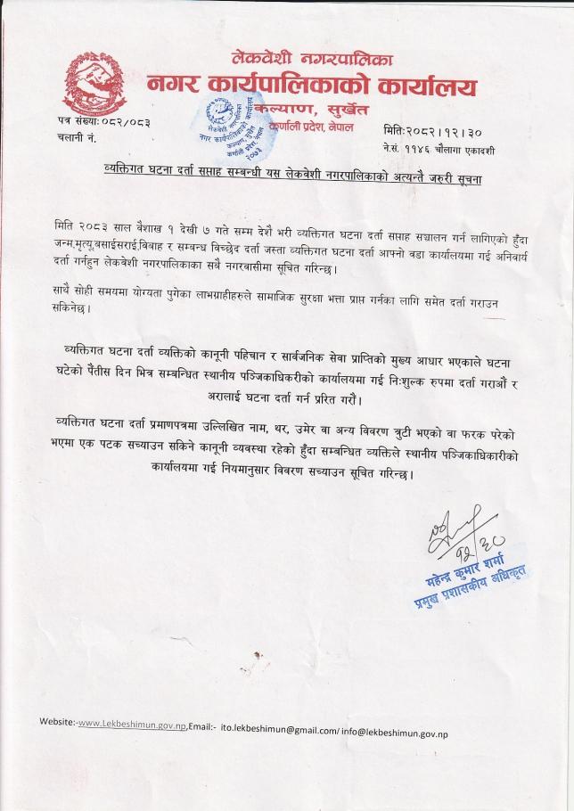 व्यक्तिगत घटना दर्ता सप्ताह सम्बन्धी यस लेकवेशी नगरपालिकाको अत्यन्तै जरुरी सूचना